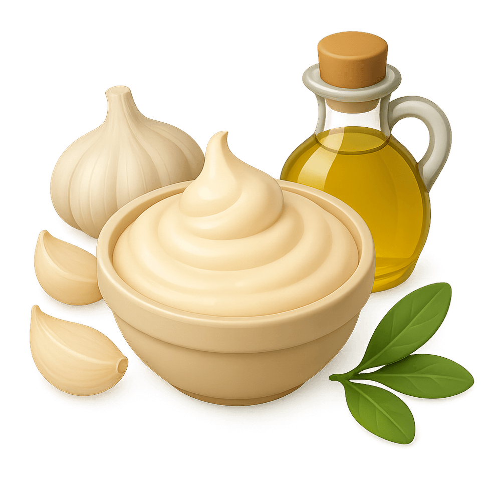 Aioli is a Mediterranean sauce made primarily from garlic, olive oil, and sometimes egg yolk. It is creamy, garlicky, and often used as a condiment or dip for vegetables, seafood, or bread.