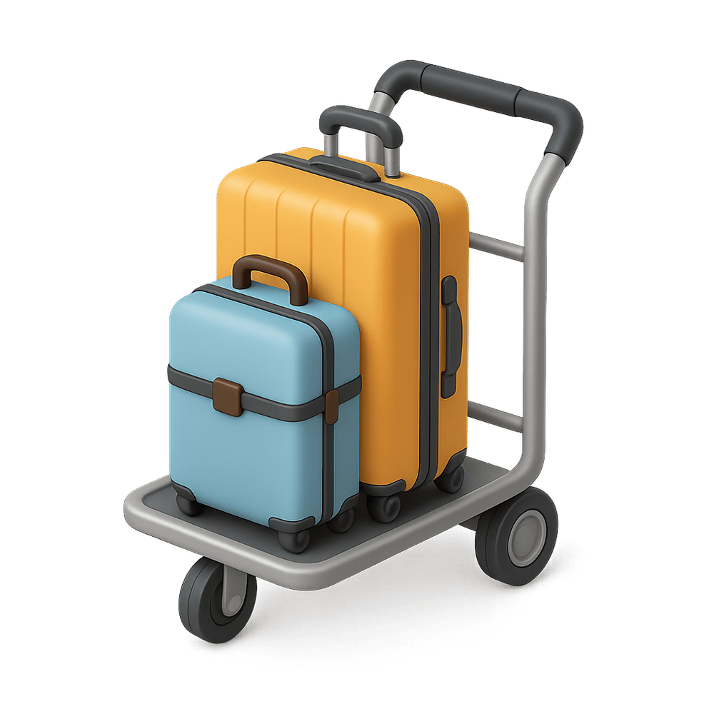 A small wheeled cart found at airports, used by travelers to transport luggage and personal items easily between terminals, parking lots, and check-in counters.