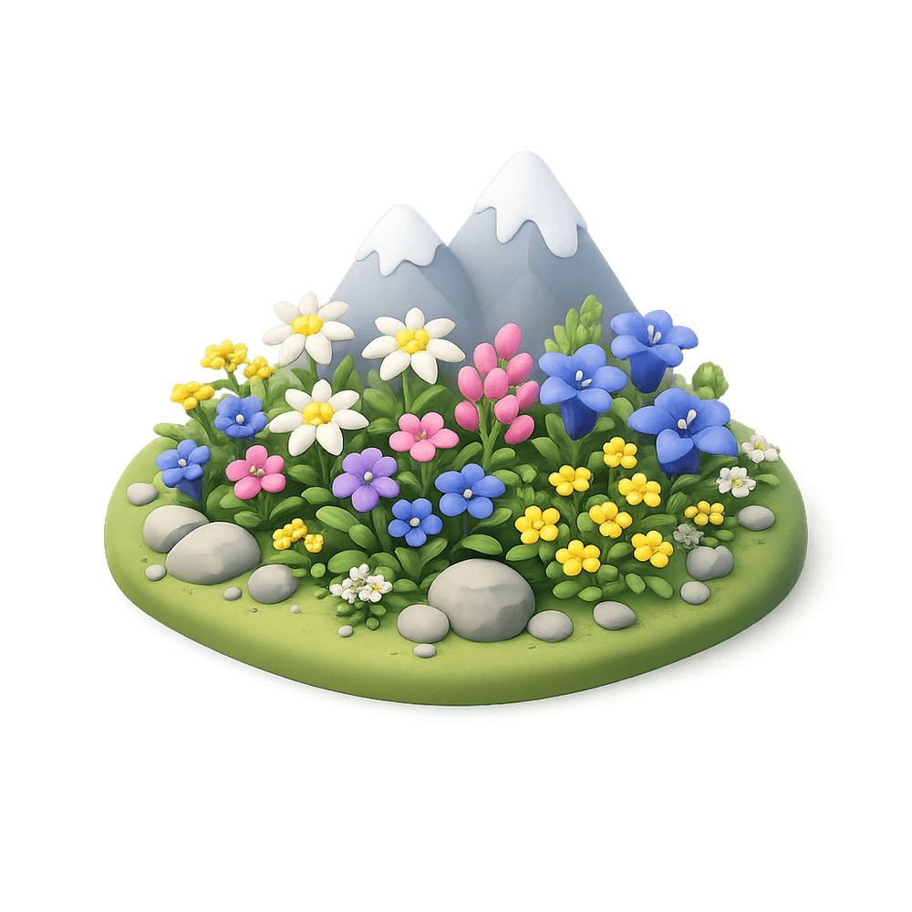 A vibrant patch of wildflowers found in alpine regions, showcasing a diverse array of colorful blooms that thrive in high-altitude environments. This natural display supports local biodiversity and offers a picturesque scene for hikers and nature enthusiasts.