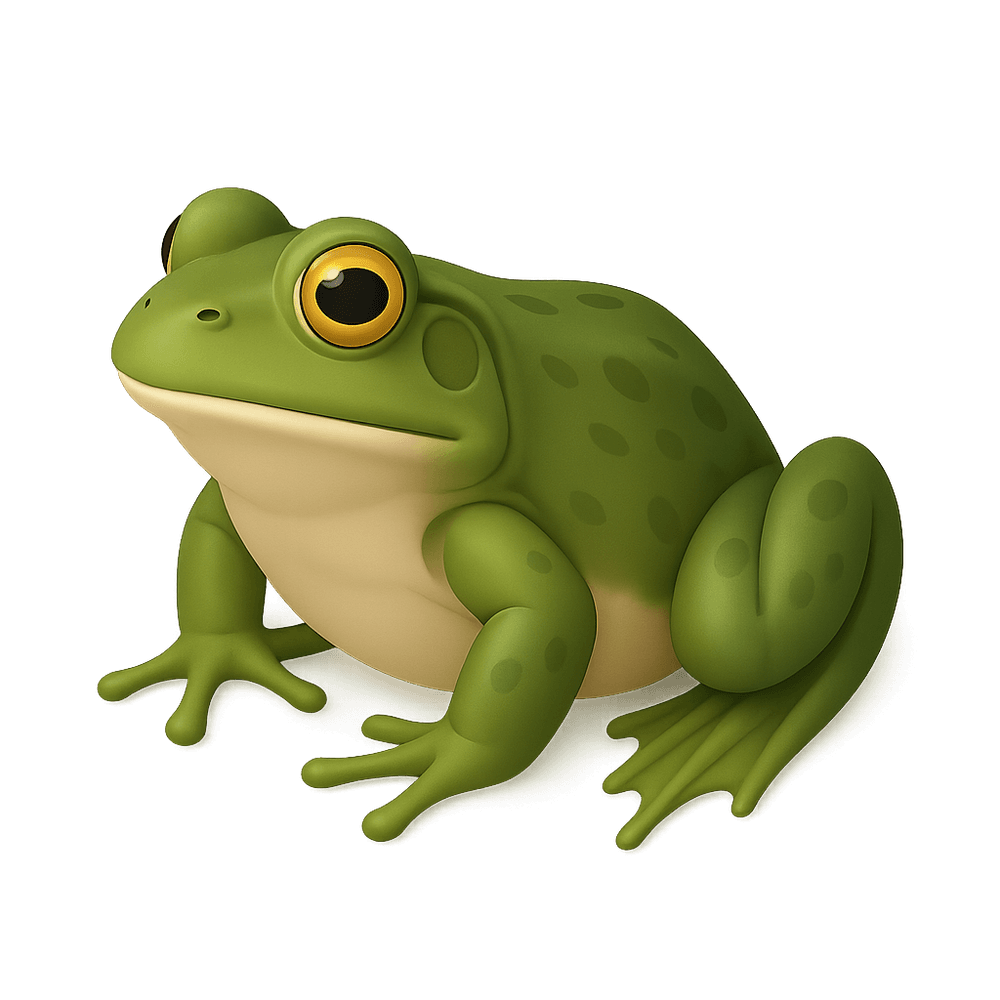 The American Bullfrog is a large, aquatic amphibian native to North America. Known for its deep croak and powerful jumping ability, it inhabits ponds, lakes, and wetlands. It is a voracious predator, feeding on insects, fish, and even small mammals.