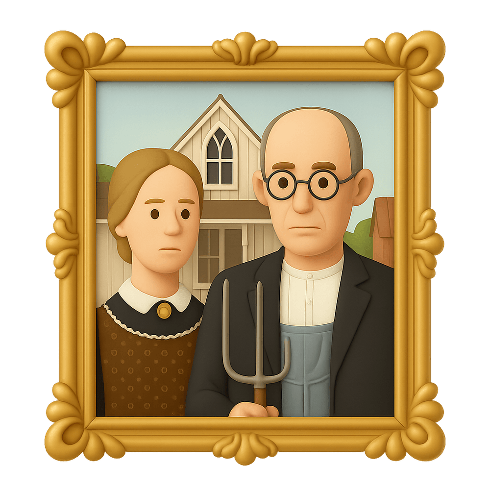 "American Gothic" is a famous 1930 painting by Grant Wood, depicting a farmer and his daughter standing in front of a rural house. The artwork is an iconic representation of American rural life and has become a symbol of Americana and 20th-century art.