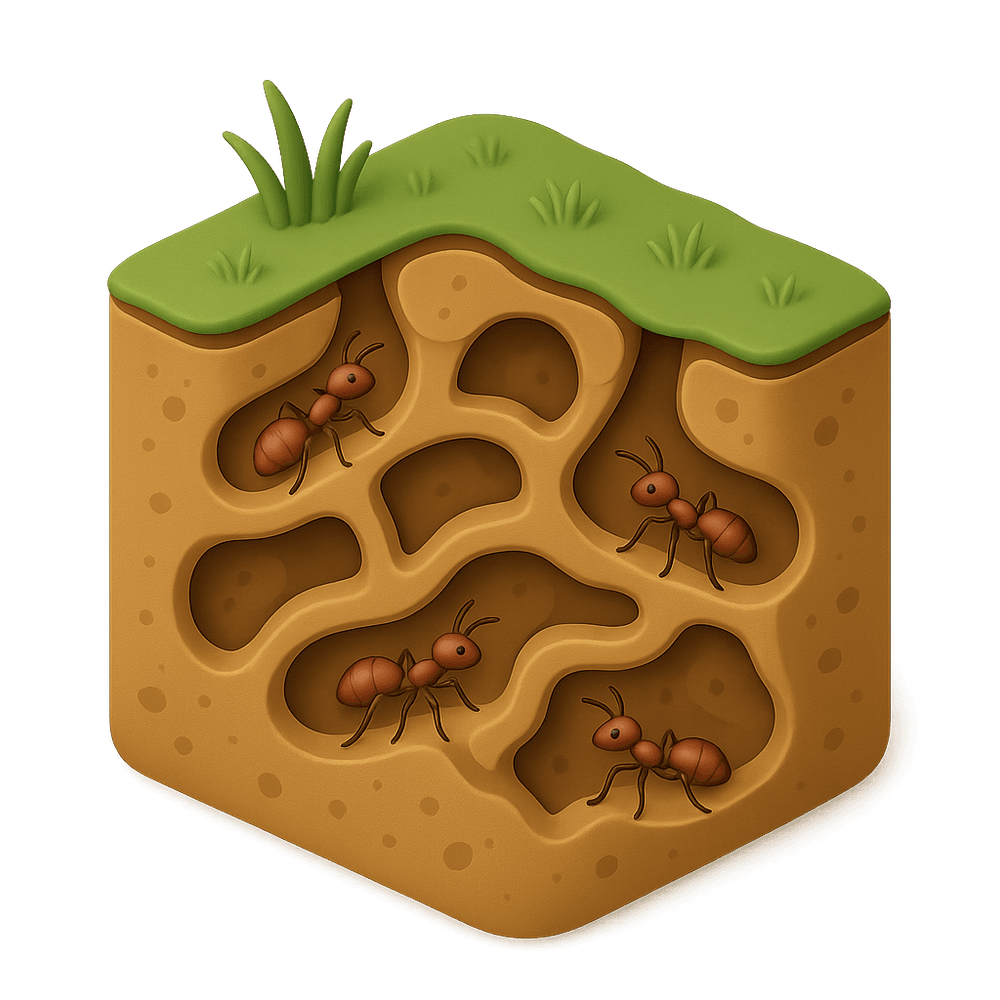 A complex network of interconnected underground tunnels and chambers created by ants for living, storing food, and raising their young. These intricate structures demonstrate advanced social organization and engineering skills in ant colonies.