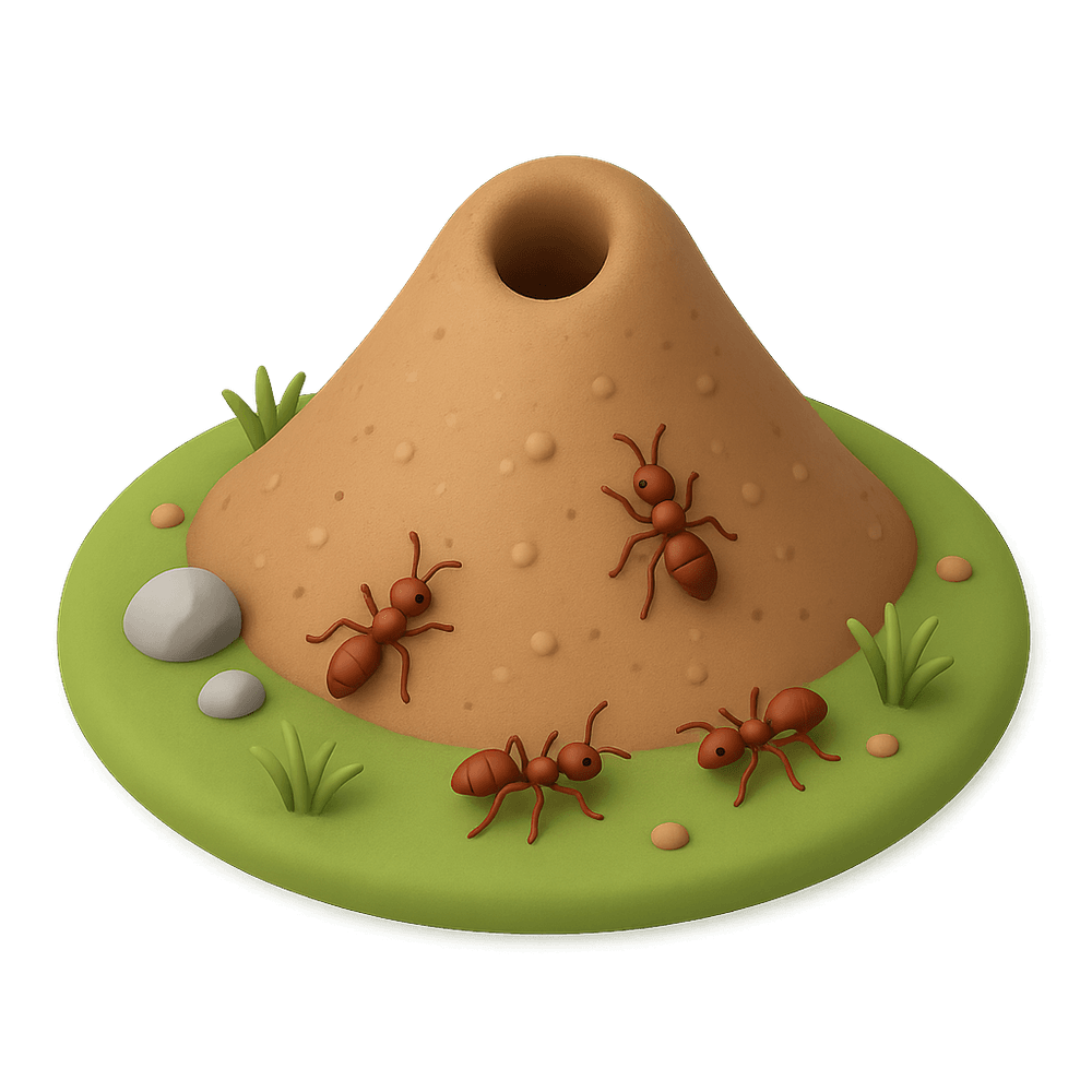 A mound of soil, sand, or clay built by ants as a nest, often featuring complex underground tunnels and chambers. Ant hills are commonly found in natural outdoor environments and are essential to local ecosystems.
