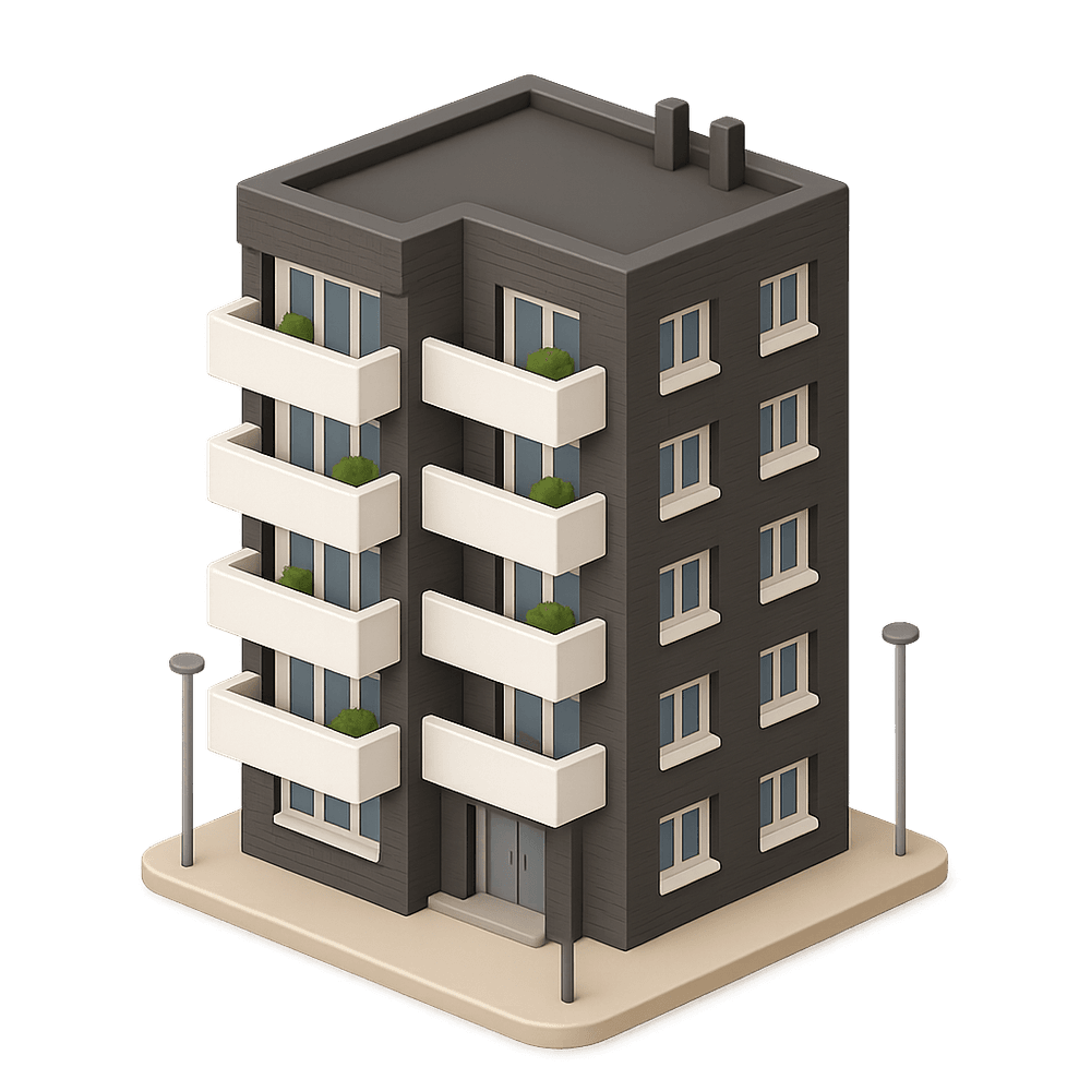 A multi-unit residential structure where multiple separate apartments are housed within one building, typically found in urban areas. Apartment buildings provide housing for many families or individuals and often include shared amenities.