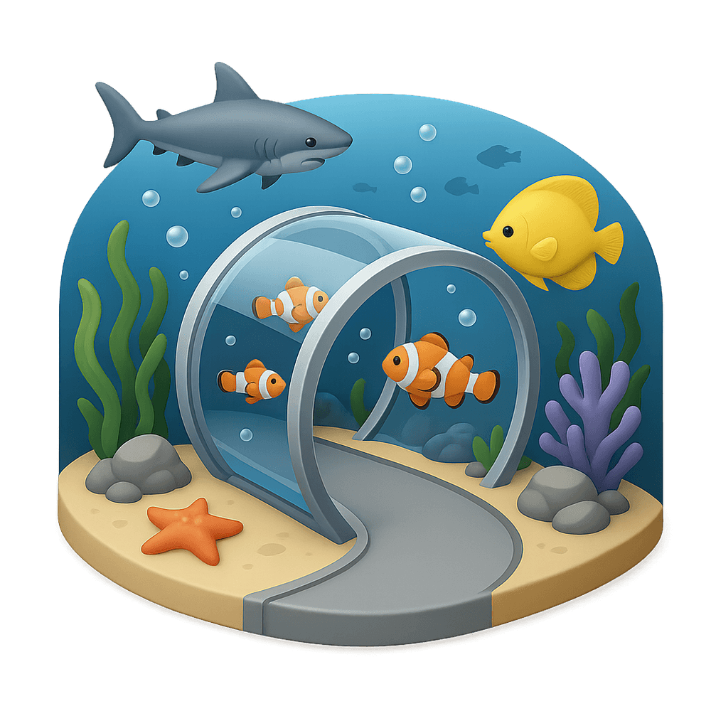 A transparent tunnel within an aquarium that allows visitors to walk through and observe aquatic life from all angles, creating an immersive underwater experience.