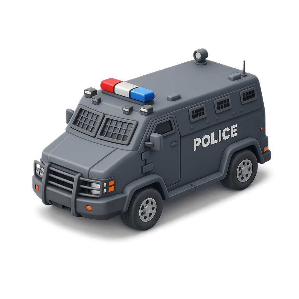A heavily fortified vehicle used by police forces for transporting officers and equipment safely in high-risk situations. Designed to withstand attacks and provide secure mobility during emergencies or riots.
