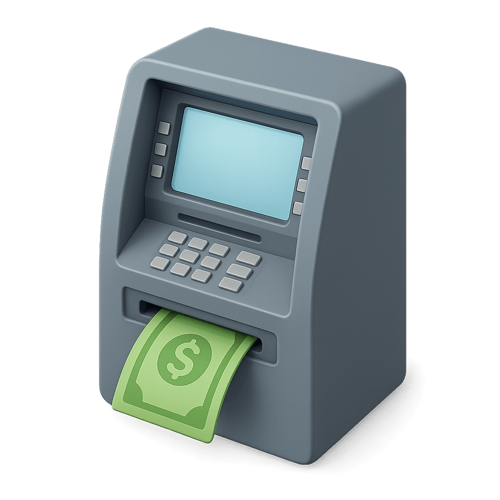 A self-service electronic machine that allows people to withdraw cash, check account balances, and perform other basic banking transactions using a bank card. Commonly found in public places for convenient access to money.