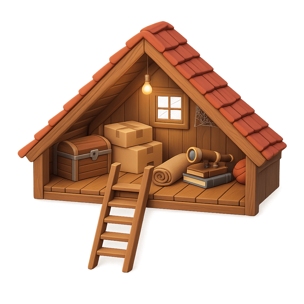An attic is a space or room located directly below the roof of a house or other building, often used for storage or sometimes converted into living space. Attics are typically accessed by a ladder or staircase and can be unfinished or finished.