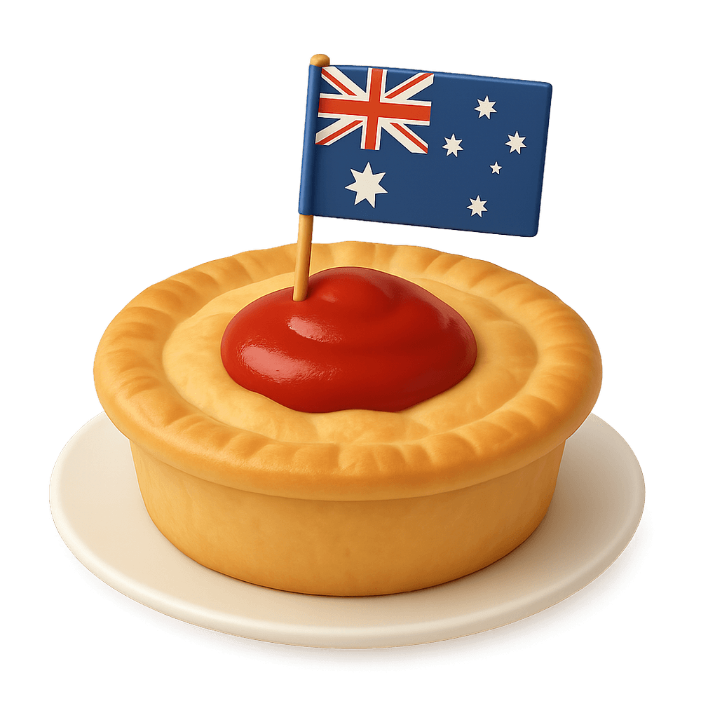 A classic Australian savory pie filled with minced meat, gravy, and sometimes vegetables, encased in a flaky pastry crust. Popular as a snack or meal, especially at sporting events and bakeries across Australia.