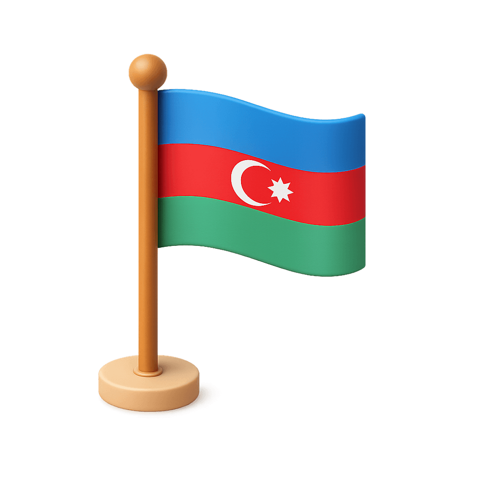 The national flag of Azerbaijan features three horizontal stripes of blue, red, and green, with a white crescent and an eight-pointed star in the center. It symbolizes the country's Turkic heritage, progress, and Islamic culture.