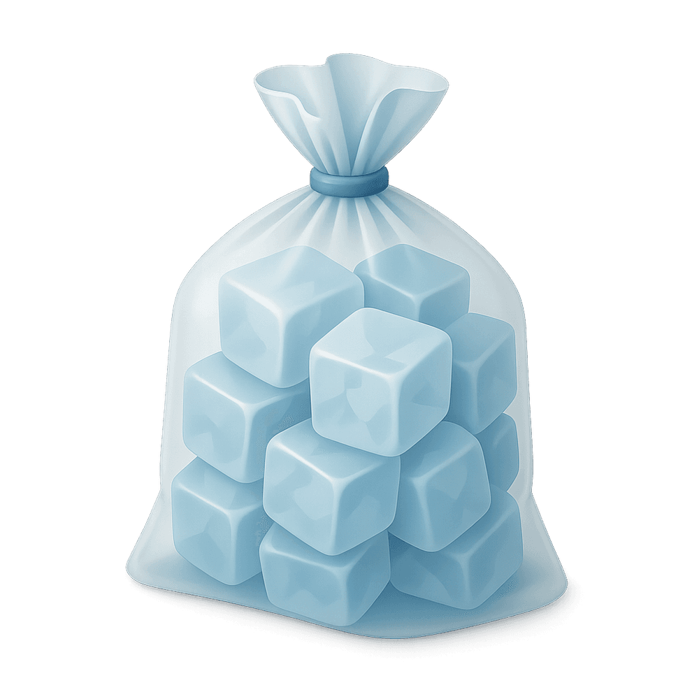 A bag of ice is a sealed plastic bag filled with ice cubes, commonly used to chill beverages, preserve food, or provide cold therapy for injuries. It is a convenient and essential item for parties, picnics, and everyday cooling needs.