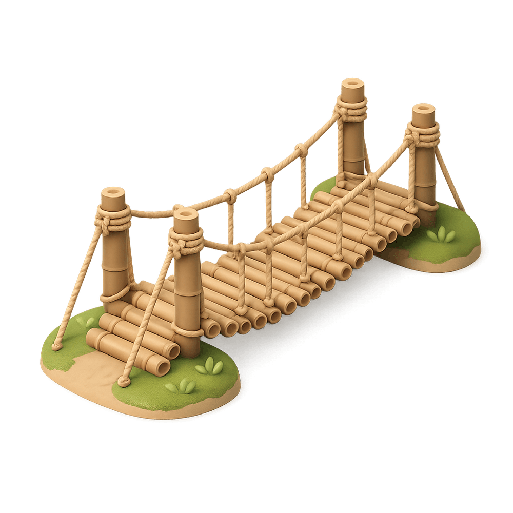 A Bamboo Suspension Bridge is a lightweight, flexible bridge constructed primarily from bamboo and rope, often found in rural or mountainous regions. It allows pedestrians to cross rivers or ravines and showcases traditional engineering techniques using natural materials.
