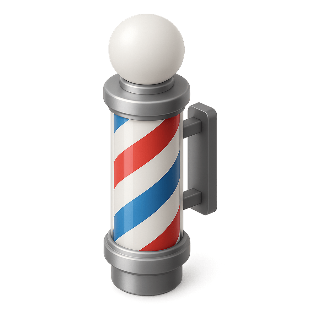 A barber pole is a traditional striped sign, usually red, white, and blue, mounted outside barbershops to indicate the location of a barber. It is an iconic symbol of the barbering profession and is often found on the exterior of barbershop buildings.