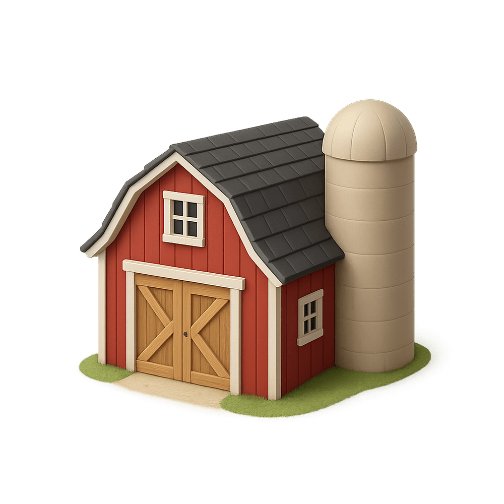 A barn is a large agricultural building typically found on farms, used for storing crops, hay, and equipment, as well as housing livestock. Barns are essential structures in rural and farming communities, often characterized by their spacious interiors and traditional wooden construction.