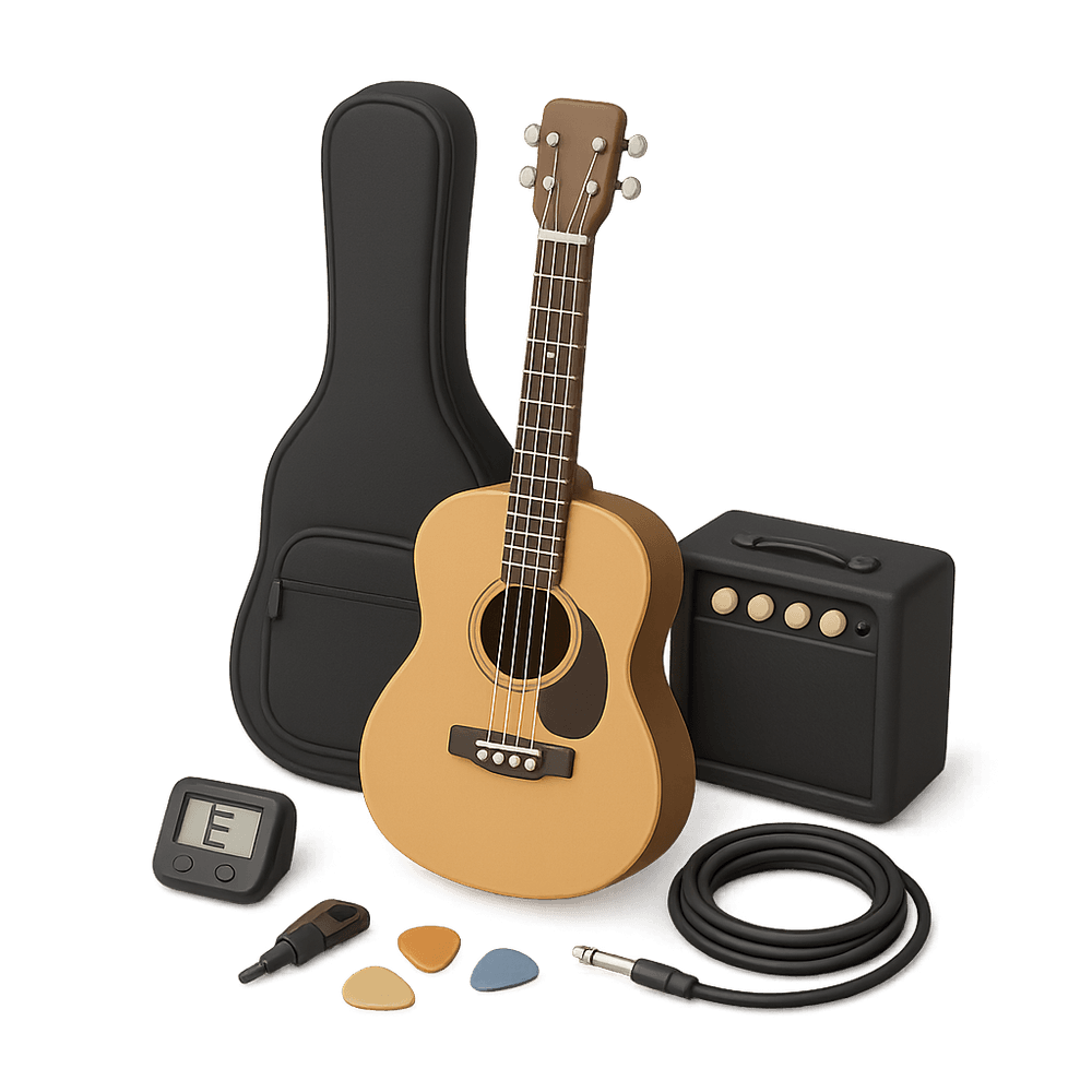A beginner-friendly kit containing an acoustic guitar, tuner, picks, strap, and instructional booklet—perfect for those starting to learn guitar as a hobby.