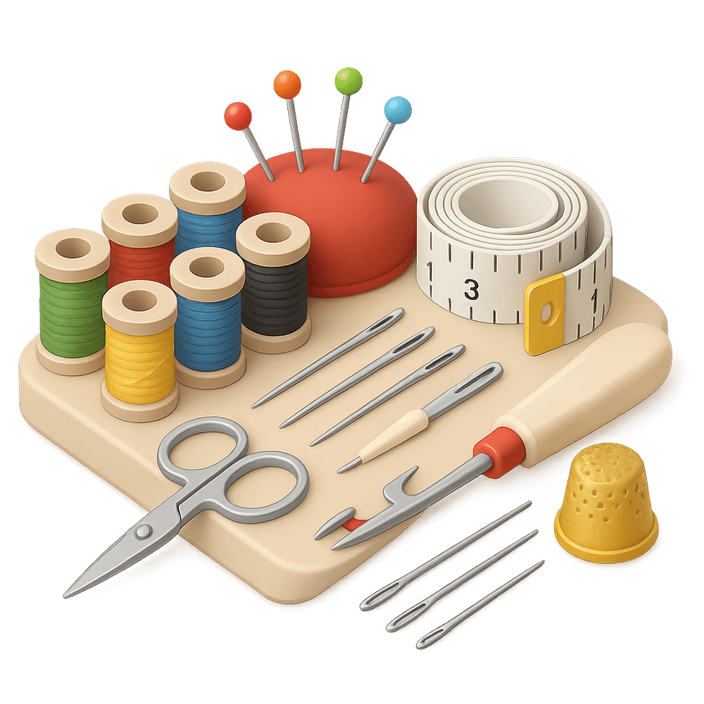 A Basic Sewing Kit contains essential tools for beginners to start sewing as a hobby. It typically includes needles, thread in various colors, a small pair of scissors, a thimble, measuring tape, pins, and a seam ripper. This kit is perfect for mending clothes, simple fabric crafts, or learning basic stitching techniques.
