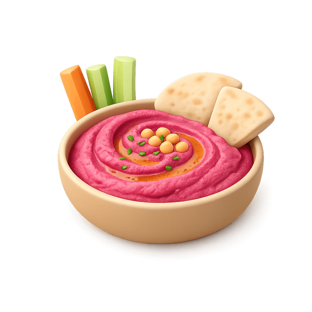 A vibrant, creamy dip made from blended chickpeas, tahini, and roasted beetroot, offering a sweet and earthy twist on traditional hummus. Popular as a healthy appetizer or snack, often served with pita bread or vegetables.