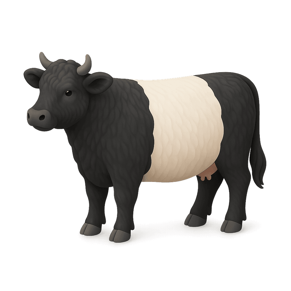 The Belted Galloway is a distinctive breed of beef cattle known for its unique white belt around its midsection and its hardy nature. Originating from Scotland, this breed is well-adapted to rough climates and is prized for its high-quality, lean meat.