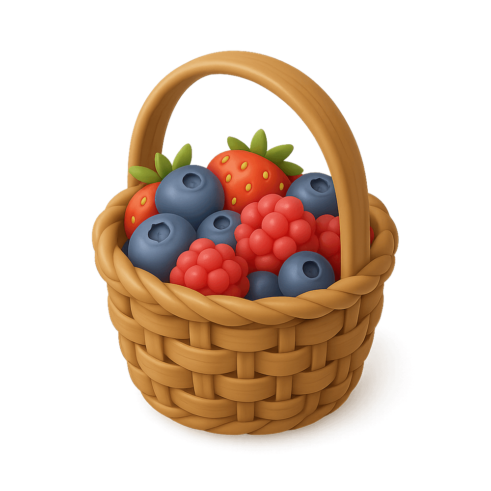 A small, woven container designed for gathering and carrying berries or other small fruits, often used during outdoor foraging or nature walks.