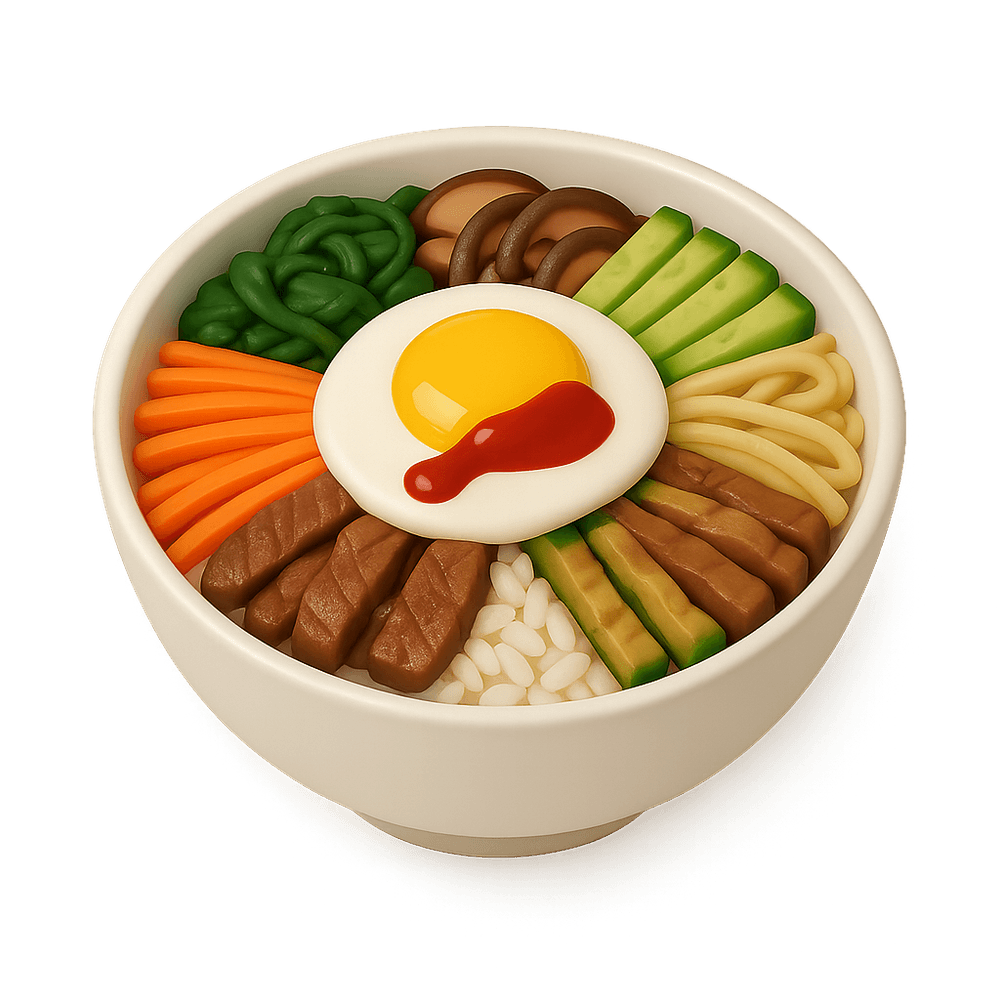 A popular Korean dish consisting of warm rice topped with assorted vegetables, sliced meat, a fried egg, and spicy gochujang sauce, all mixed together before eating.