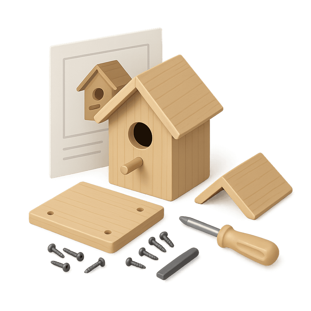A complete kit for building and decorating your own birdhouse at home. Includes pre-cut wooden pieces, nails, paint, brushes, and easy-to-follow instructions. Perfect for hobbyists who enjoy woodworking, crafting, and bird watching.