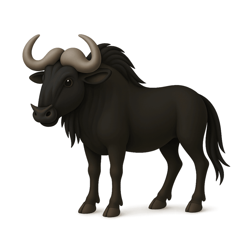 The Black Wildebeest is a large, herbivorous mammal native to southern Africa, known for its distinctive dark coat, white tail, and forward-curving horns. It inhabits open grasslands and is recognized for its migratory behavior and social herds.