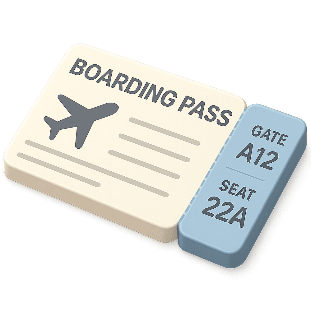 A boarding pass is a document provided by an airline during check-in, giving a passenger permission to enter the restricted area of an airport and to board the airplane for a particular flight. It contains essential travel details such as the passenger's name, flight number, seat assignment, and departure gate.