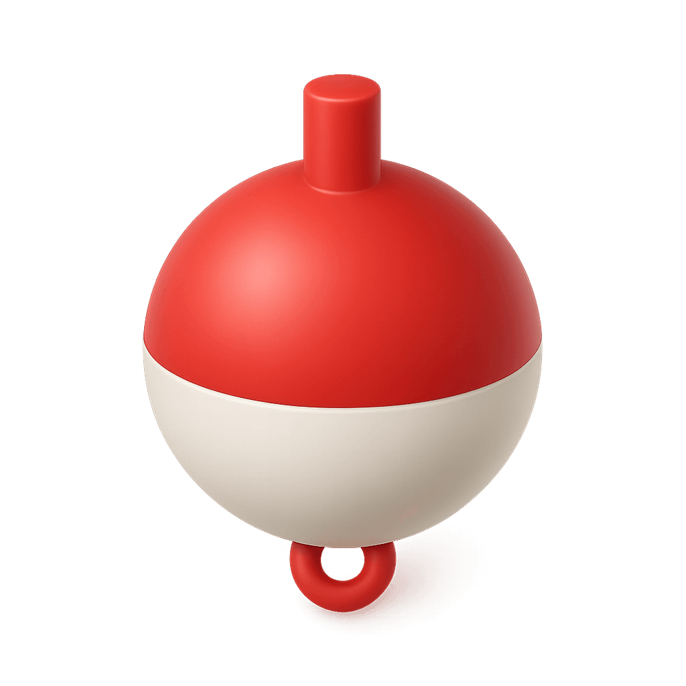 A bobber is a small, buoyant device used in fishing to suspend bait at a set depth and signal when a fish bites. It floats on the water's surface and moves when a fish tugs the line, making it easier for anglers to detect bites.