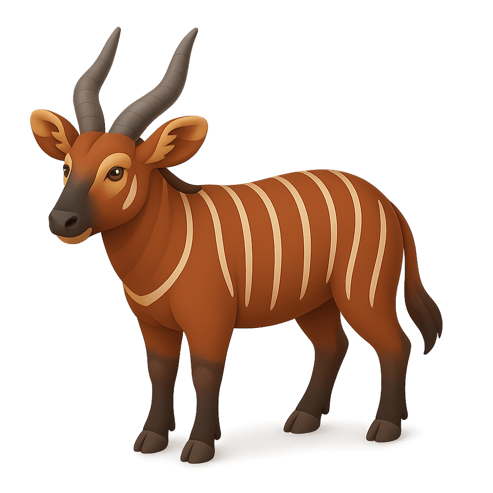 The Bongo antelope is a large, strikingly patterned herbivorous mammal native to the forests of central and western Africa. Known for its reddish-brown coat with white stripes and long, spiraled horns, the bongo is a shy and elusive species often found in dense, tropical habitats.