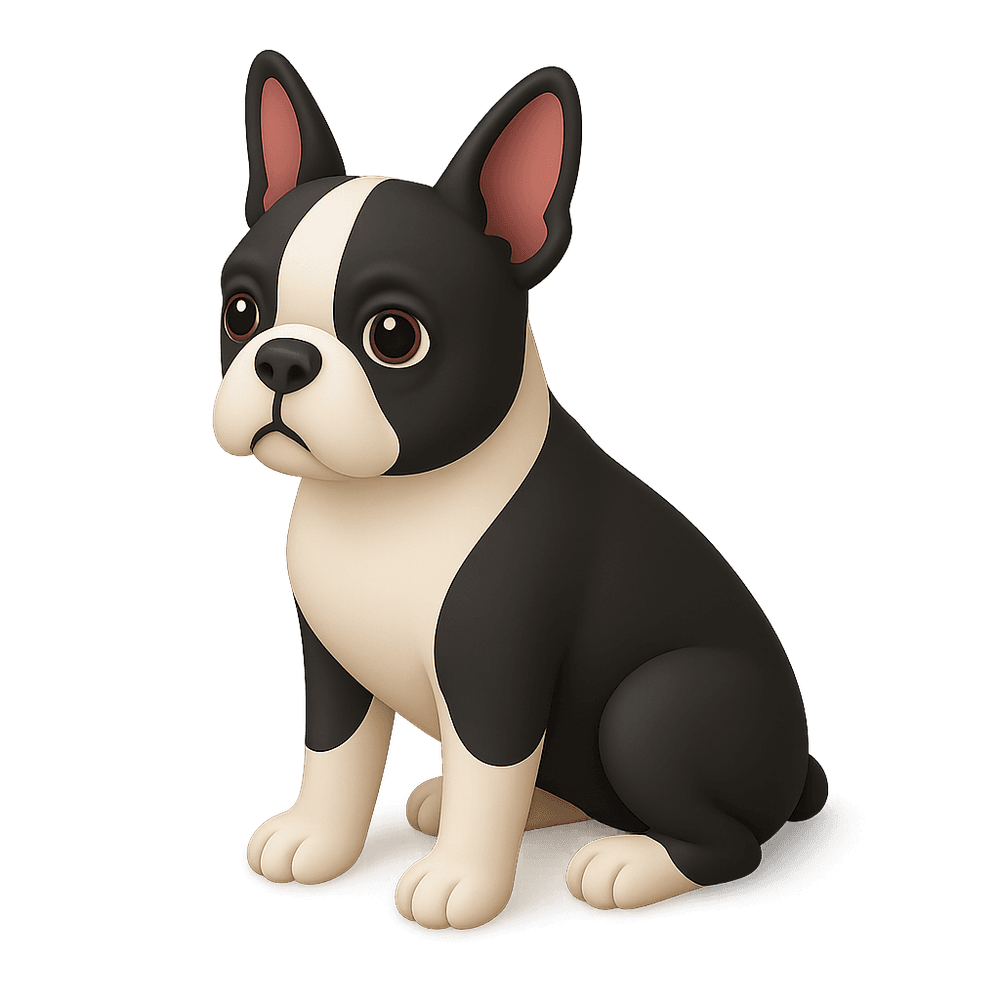 The Boston Terrier is a small, friendly, and intelligent dog breed known for its tuxedo-like markings and affectionate nature. Originally bred in the United States, this compact companion is popular as a family pet and is recognized for its playful and gentle temperament.