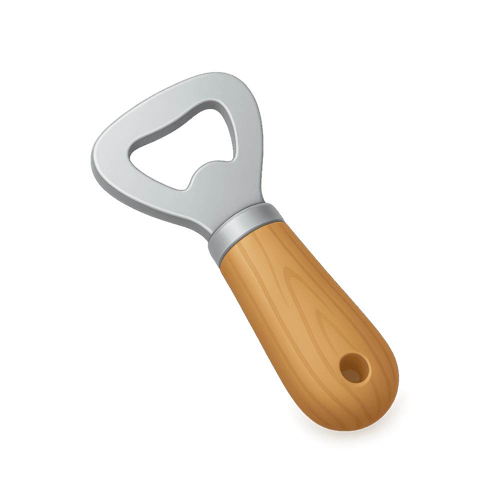 A bottle opener is a small handheld tool designed to remove caps or lids from bottles, especially those with metal caps. It is a common item found in kitchens and bars, making it easy to open beverages like soda or beer.