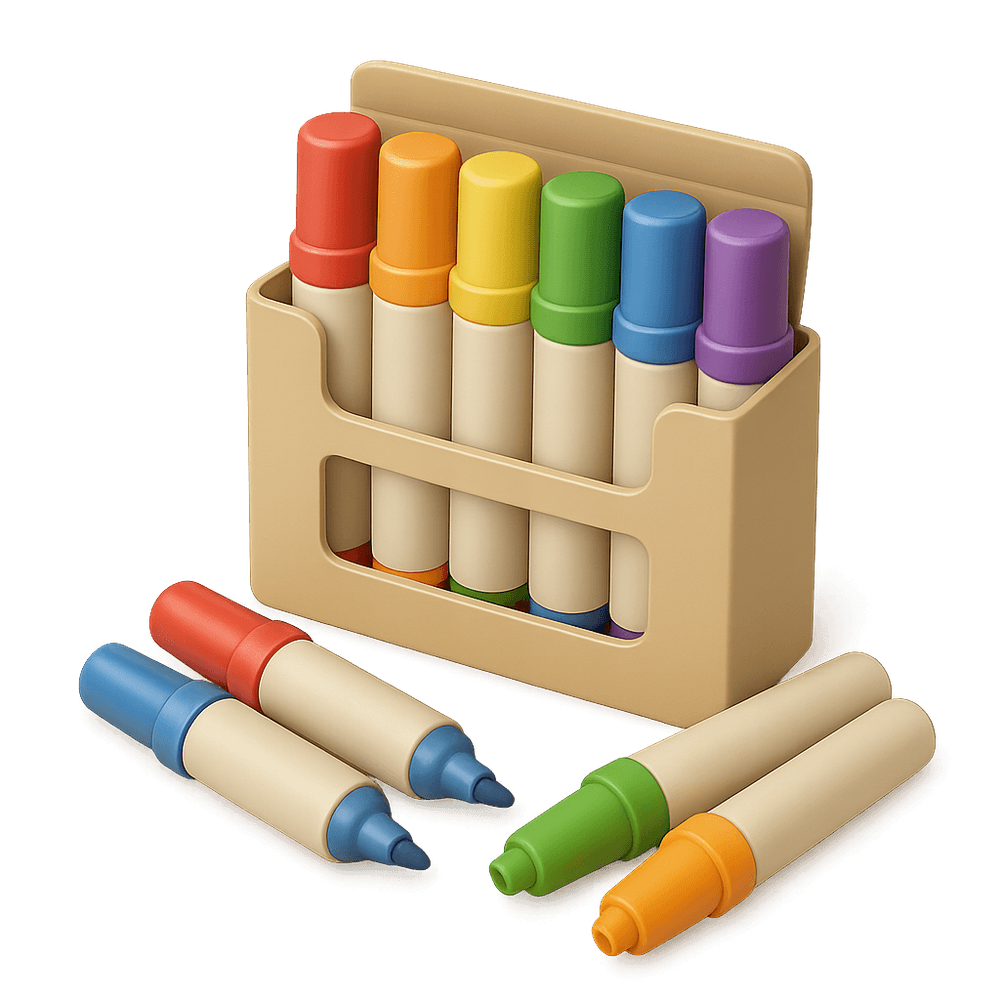 A box of markers contains multiple colored markers, commonly used for drawing, coloring, and writing. It is a versatile tool for both children and adults in everyday life, suitable for creative projects, schoolwork, and office tasks.