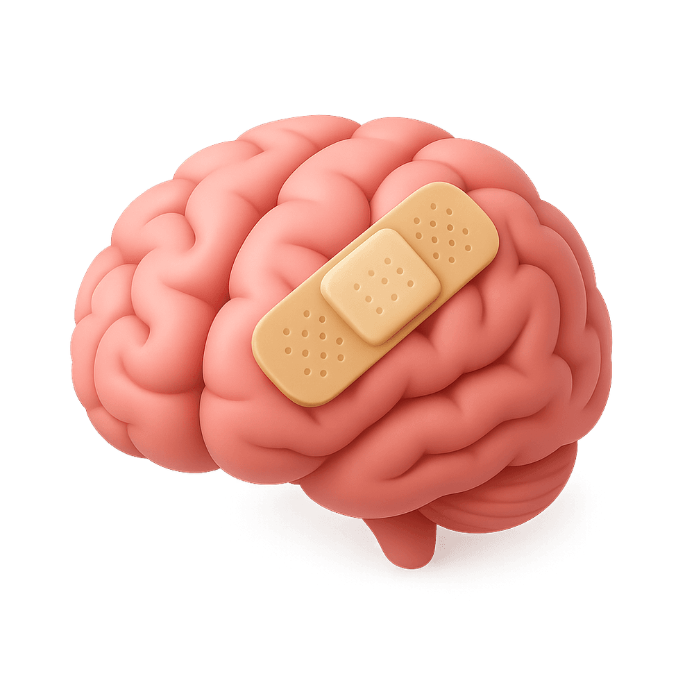 A symbolic representation of mental healing or recovery, featuring a brain with a Band-Aid to illustrate the concept of addressing psychological wounds or mental health challenges.