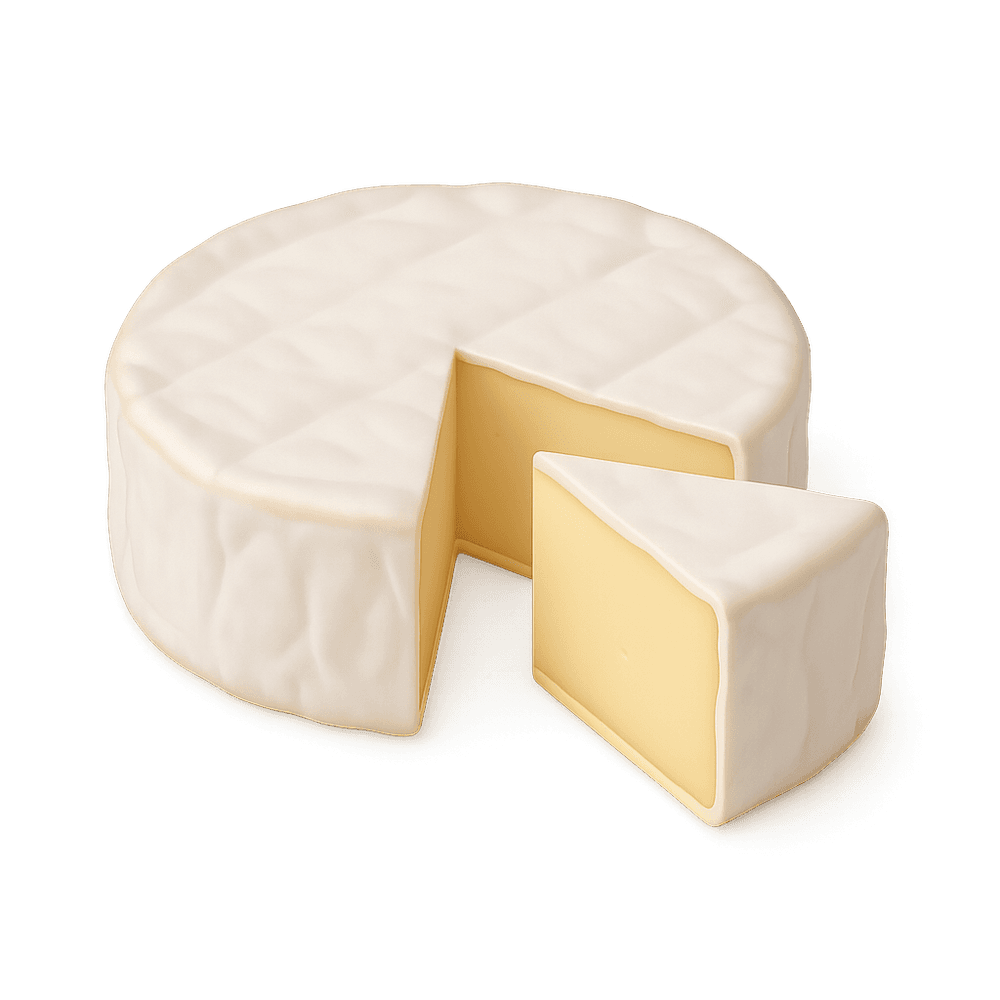 A soft French cheese with a creamy interior and edible white rind, known for its mild, buttery flavor. Often enjoyed with bread, fruit, or wine.