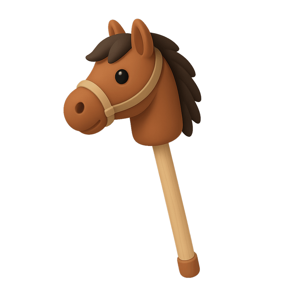 A broomstick pony is a simple toy made by attaching a horse's head, often made of fabric or wood, to a stick. Children use it to pretend they are riding a horse, making it popular in imaginative play and informal races or games.