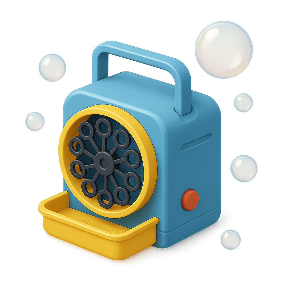 A bubble machine is a device that automatically produces streams of bubbles for entertainment purposes, often used at parties, events, or for children's play.