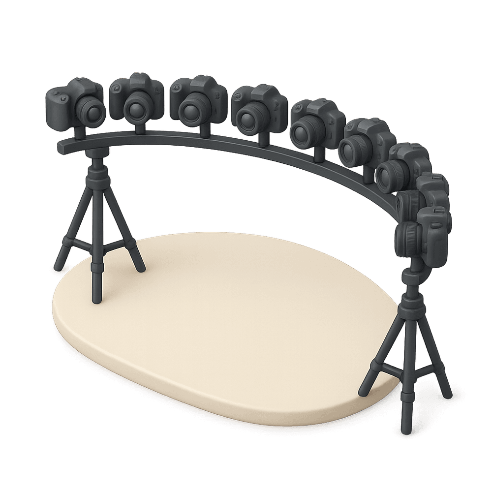 A Bullet Time Camera Rig is a specialized array of cameras arranged in a precise arc or circle, used to capture a subject from multiple angles simultaneously. This technology enables the creation of 'bullet time' or frozen-moment visual effects, famously used in movies and commercials to create dynamic, time-slowing shots.