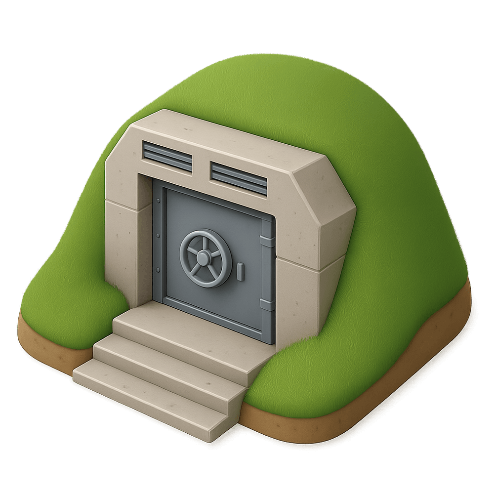 A bunker is a reinforced underground shelter designed to protect people or valuables from danger, such as attacks, natural disasters, or other emergencies. Bunkers are often used for military, civil defense, or survival purposes.