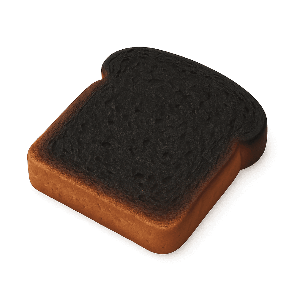 A slice of bread that has been toasted until it is blackened and charred, often resulting in a bitter taste and crispy texture. Burnt toast is a common kitchen mishap in everyday life.