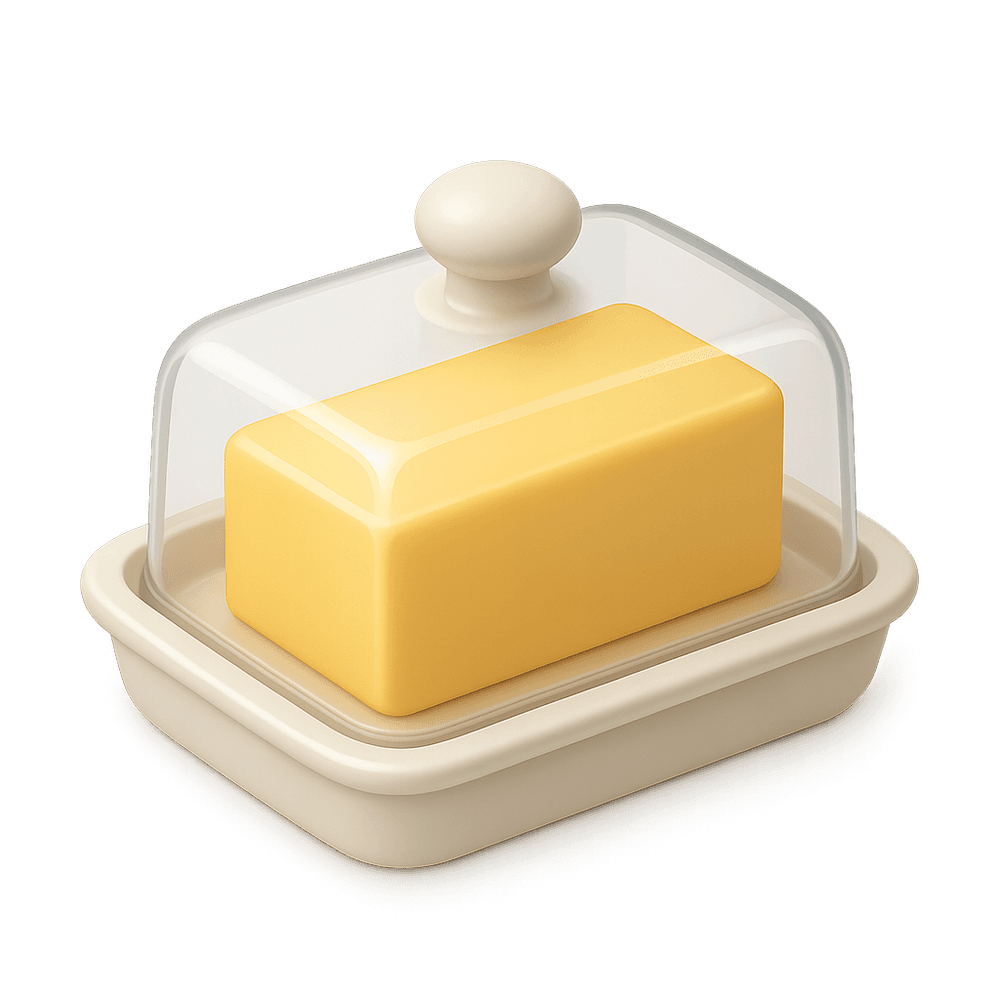A butter dish is a small container designed to hold and serve butter, keeping it fresh and easily accessible at the dining table. It often comes with a lid to protect the butter from contaminants and maintain its consistency.