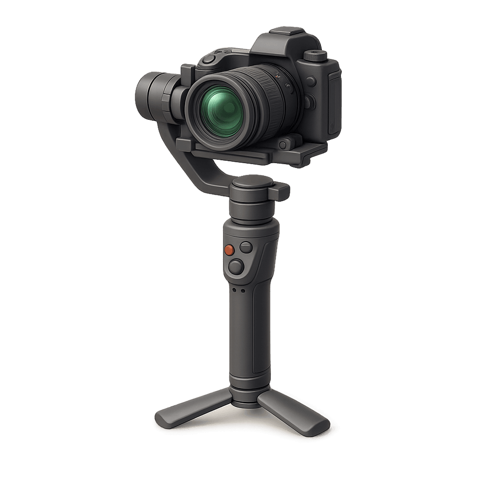 A camera mounted on a gimbal, providing stabilized video and smooth motion for professional or creative filming. Commonly used in filmmaking, broadcasting, and content creation to achieve steady shots even while moving.