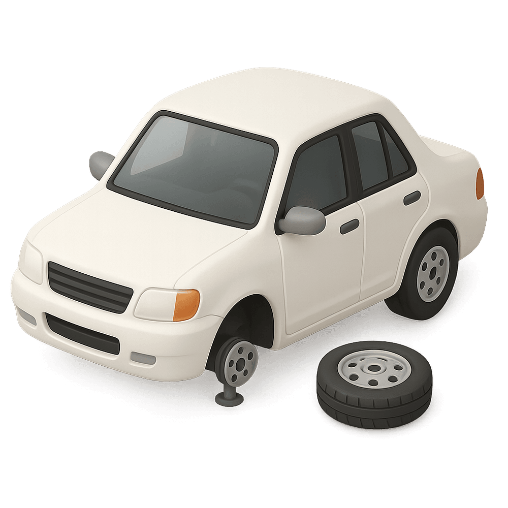 A car that is missing one of its wheels, making it non-functional for driving. Often seen as a symbol of breakdown or in need of repair.