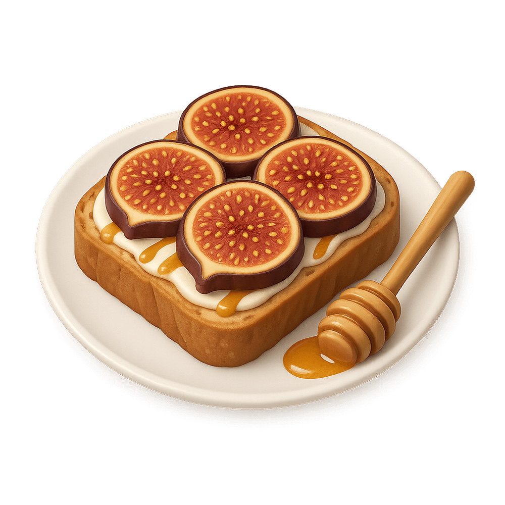 A gourmet toast topped with caramelized figs, often served on artisan bread and finished with a drizzle of honey or cheese. A sweet and savory treat perfect for breakfast or as a snack.