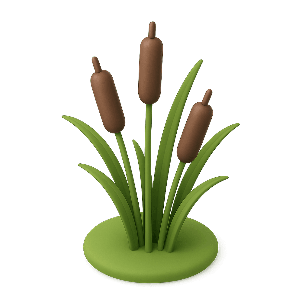 A tall, reedy wetland plant with brown, sausage-shaped flower spikes, commonly found near ponds and marshes. Cattails provide habitat for wildlife and are important for wetland ecosystems.