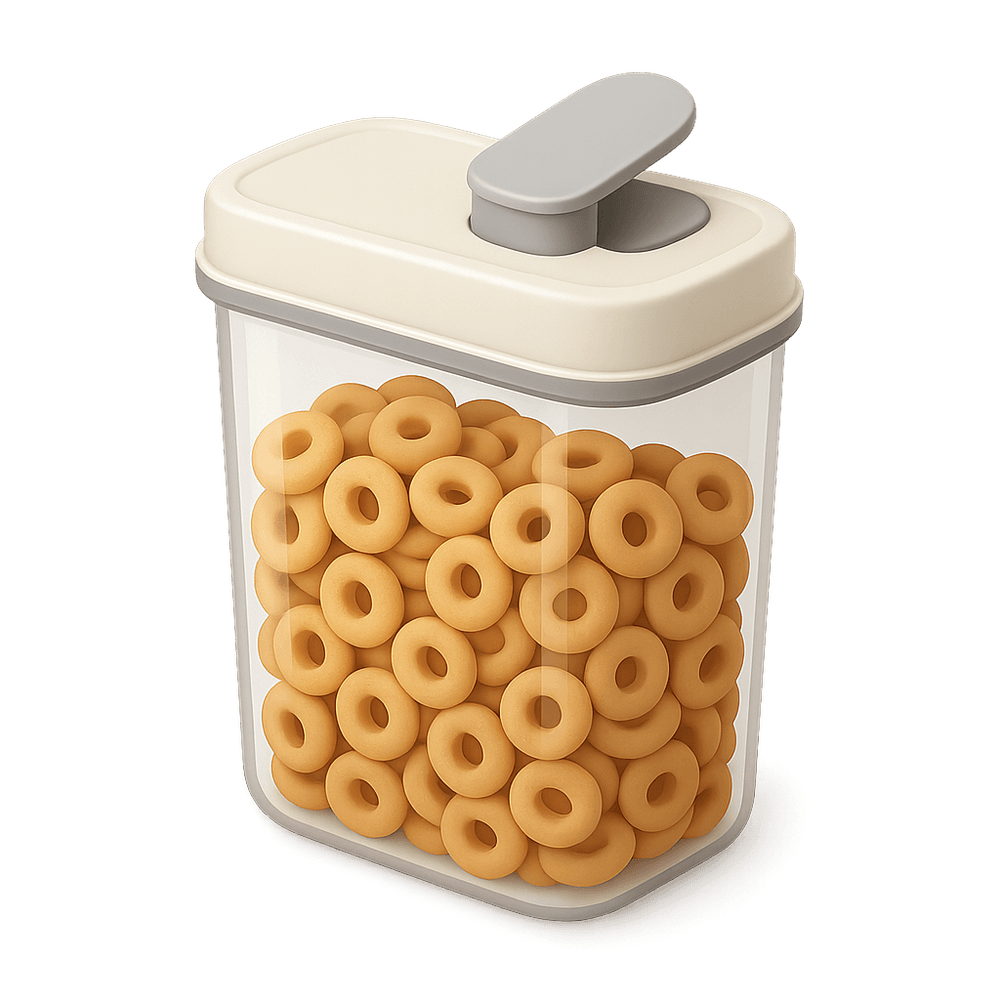 A cereal container is a kitchen storage item designed to keep breakfast cereals fresh and organized. It typically features an airtight seal and a pour spout for easy dispensing.