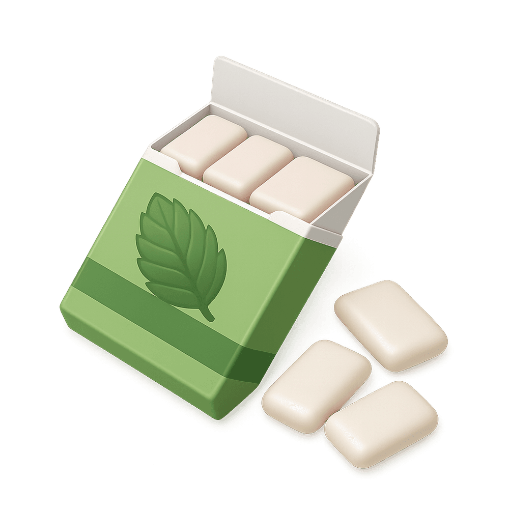 A sweet, flavored, and chewy substance designed to be chewed but not swallowed. Chewing gum is popular for freshening breath, enjoyment, and sometimes for stress relief.
