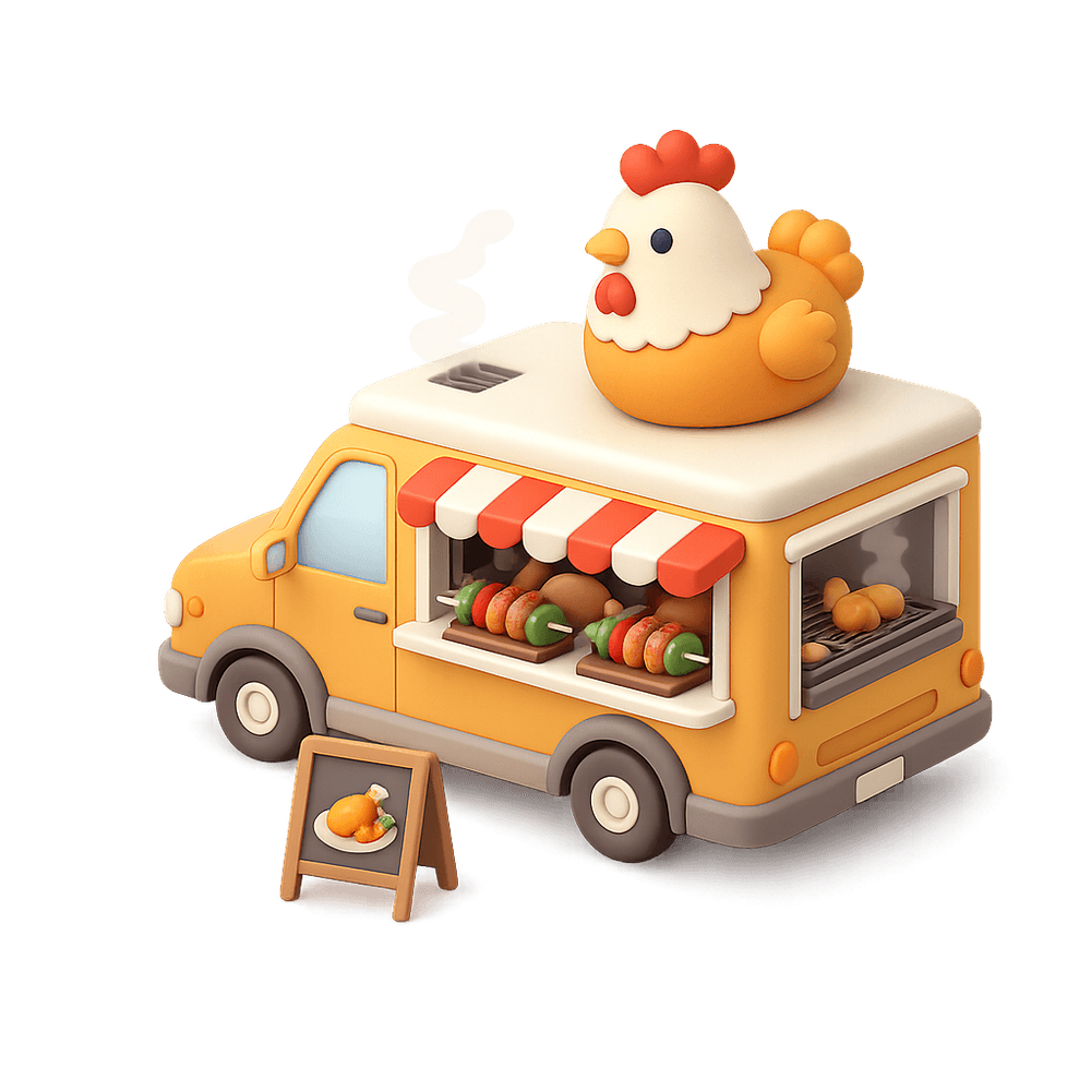 A mobile food service vehicle specializing in chicken-based dishes, serving customers at various locations and events. Popular for its convenience and flavorful menu options.