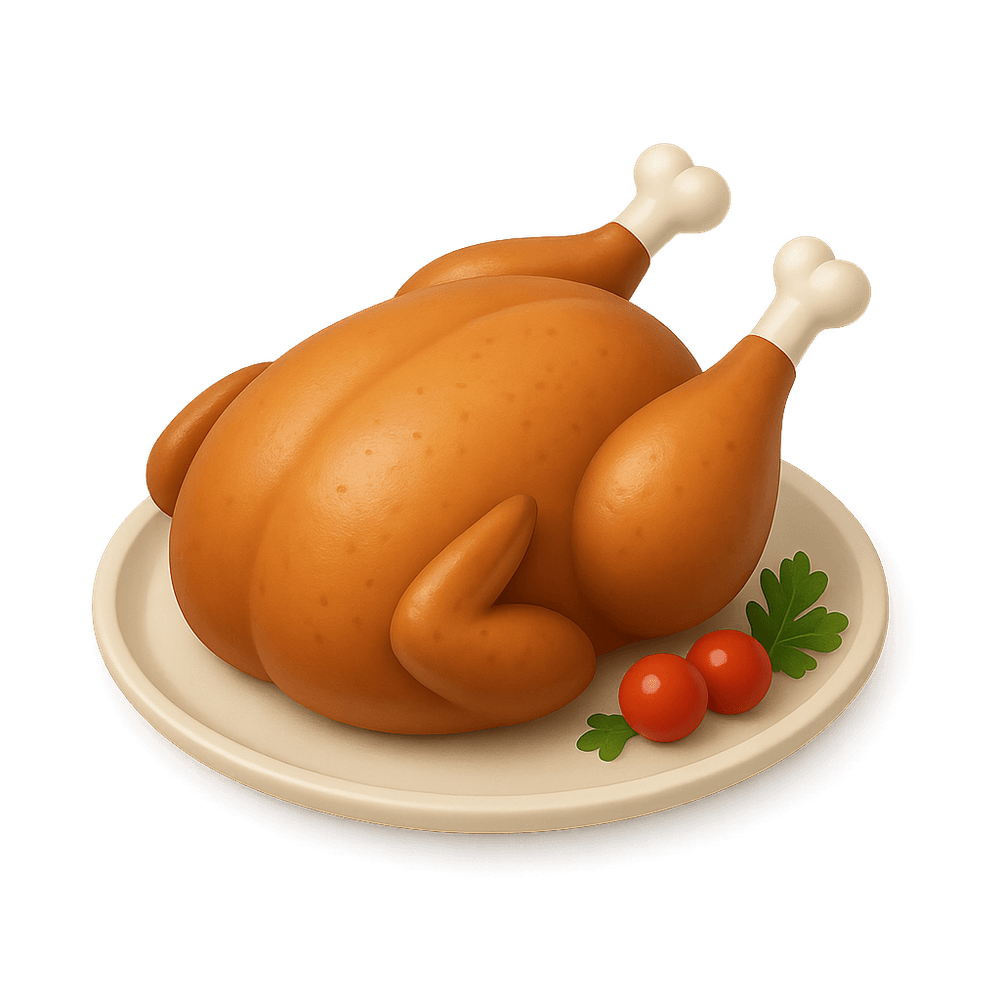 A whole chicken that has been cooked by roasting, resulting in crispy skin and juicy meat. Roasted chicken is a classic dish enjoyed in many cuisines around the world and is often served as a main course.