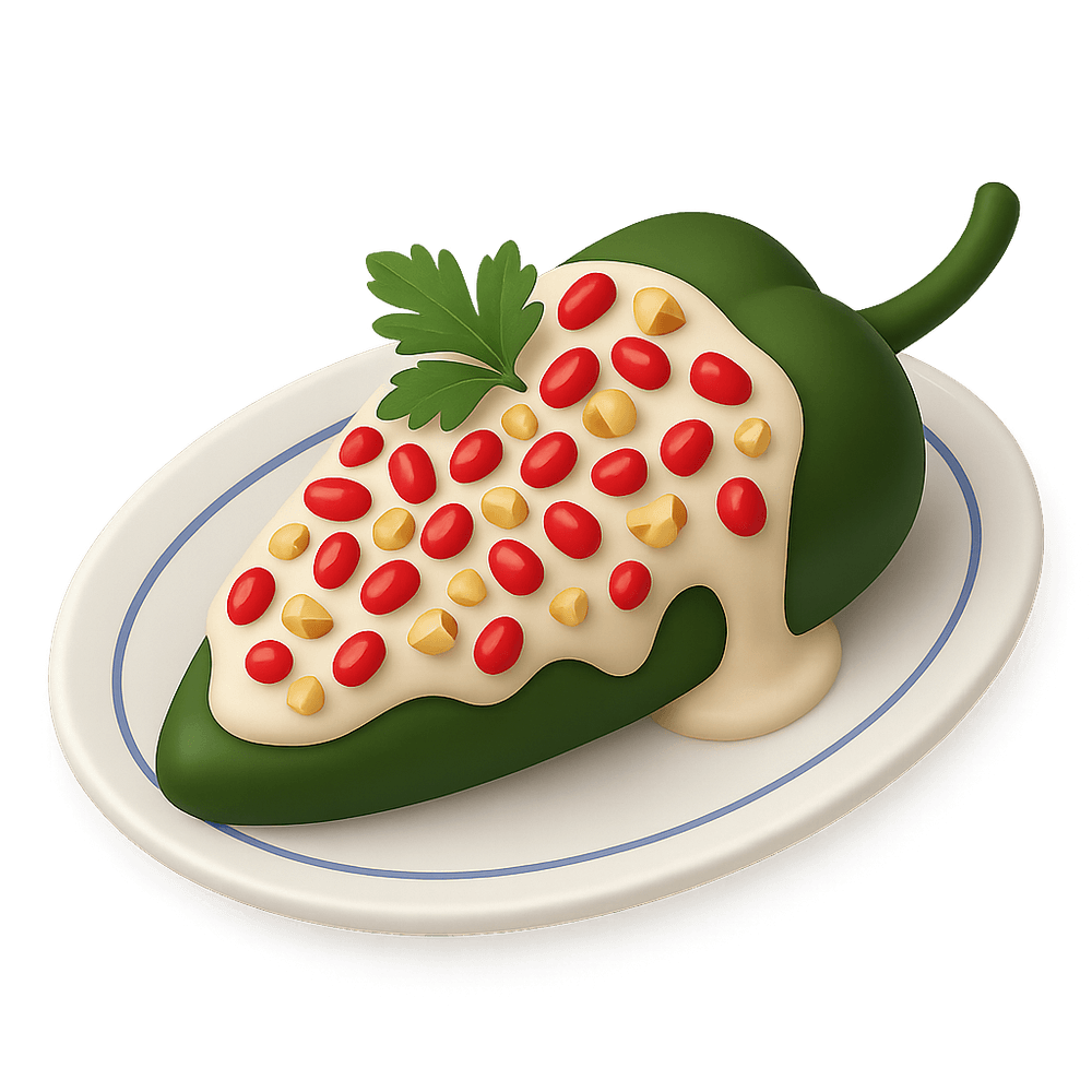 Chile en Nogada is a traditional Mexican dish featuring poblano chiles stuffed with a savory-sweet picadillo, topped with a creamy walnut sauce, pomegranate seeds, and parsley. It is often served during Mexican Independence celebrations and is known for its vibrant colors representing the Mexican flag.