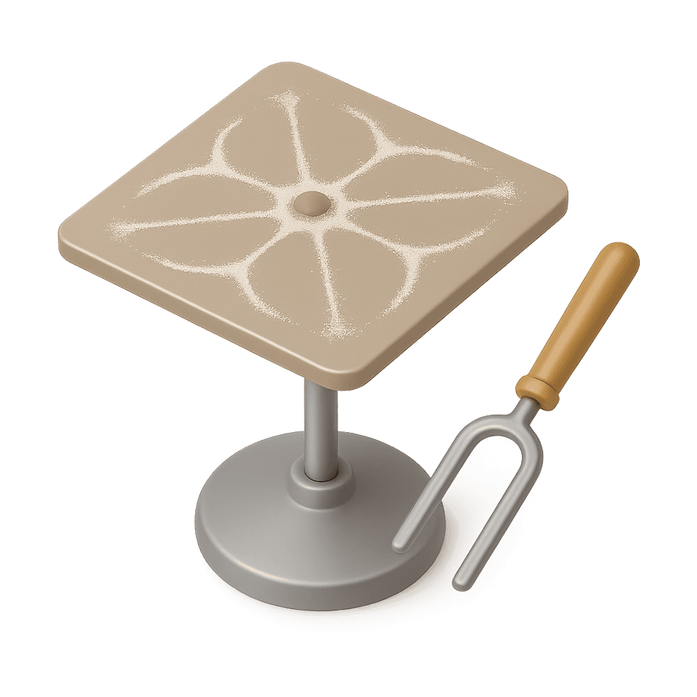 A Chladni Plate is a flat metal plate used in physics experiments to visualize sound vibrations. When the plate is vibrated, sand sprinkled on its surface forms intricate patterns at the nodes of standing waves, revealing the physical properties of sound and resonance.